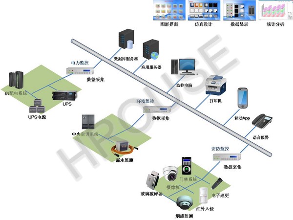 监测内容包括:供配电系统、UPS电源、空调、漏水、红外入侵、烟感、门禁、玻璃破碎、视频