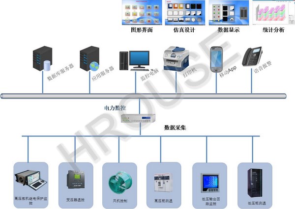 监控内容:高压微机继电保护监控、变压器温控、风机控制、高压柜测温、低压输出回路监控、低压柜测温